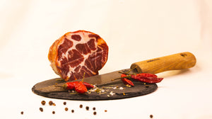 Unser Capocollo Dolce ist eine zart gereifte, luftgetrocknete italienische Delikatesse, die aus hochwertigem Schweinenacken hergestellt wird. Durch eine schonende Reifung und eine feine Würzung entfaltet dieser edle Schinken sein mildes, vollmundiges Aroma – sanft würzig, leicht nussig und angenehm zart im Biss.